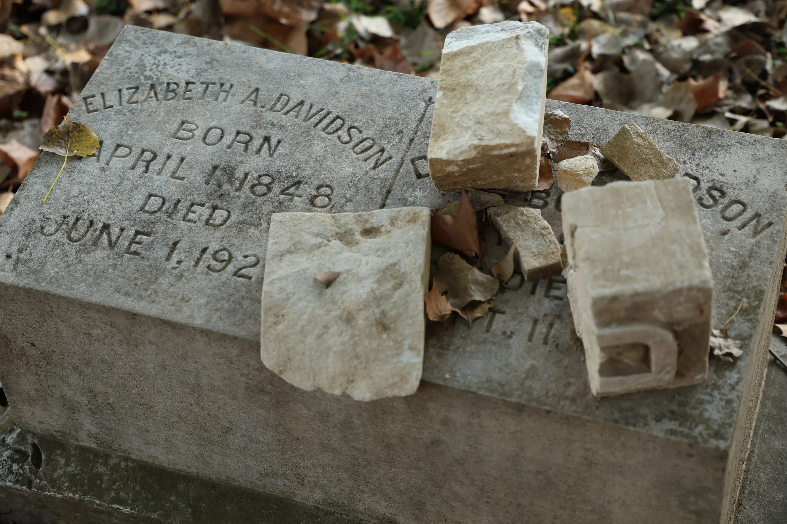 Damaged headstones of two brothers, Samuel and 11-year-old Charles Newton. Because of where Samuel's headstone broke off, his age has been lost. The headstone of their older sister, Eliza, has also been broken and knocked to the ground.