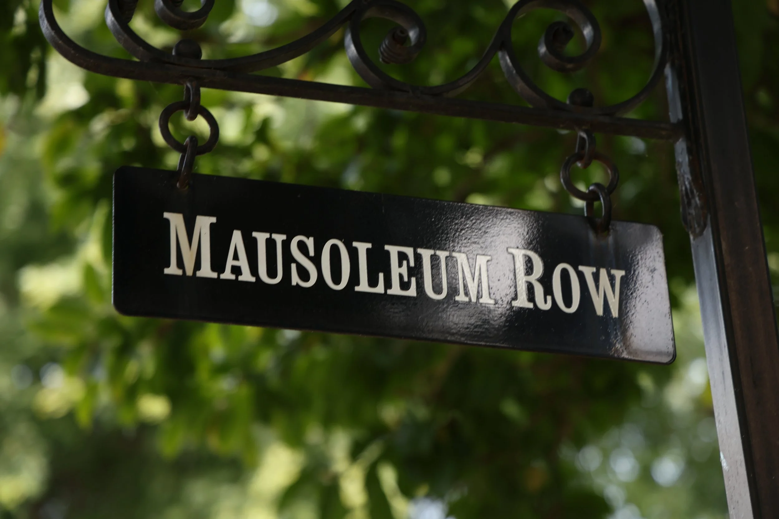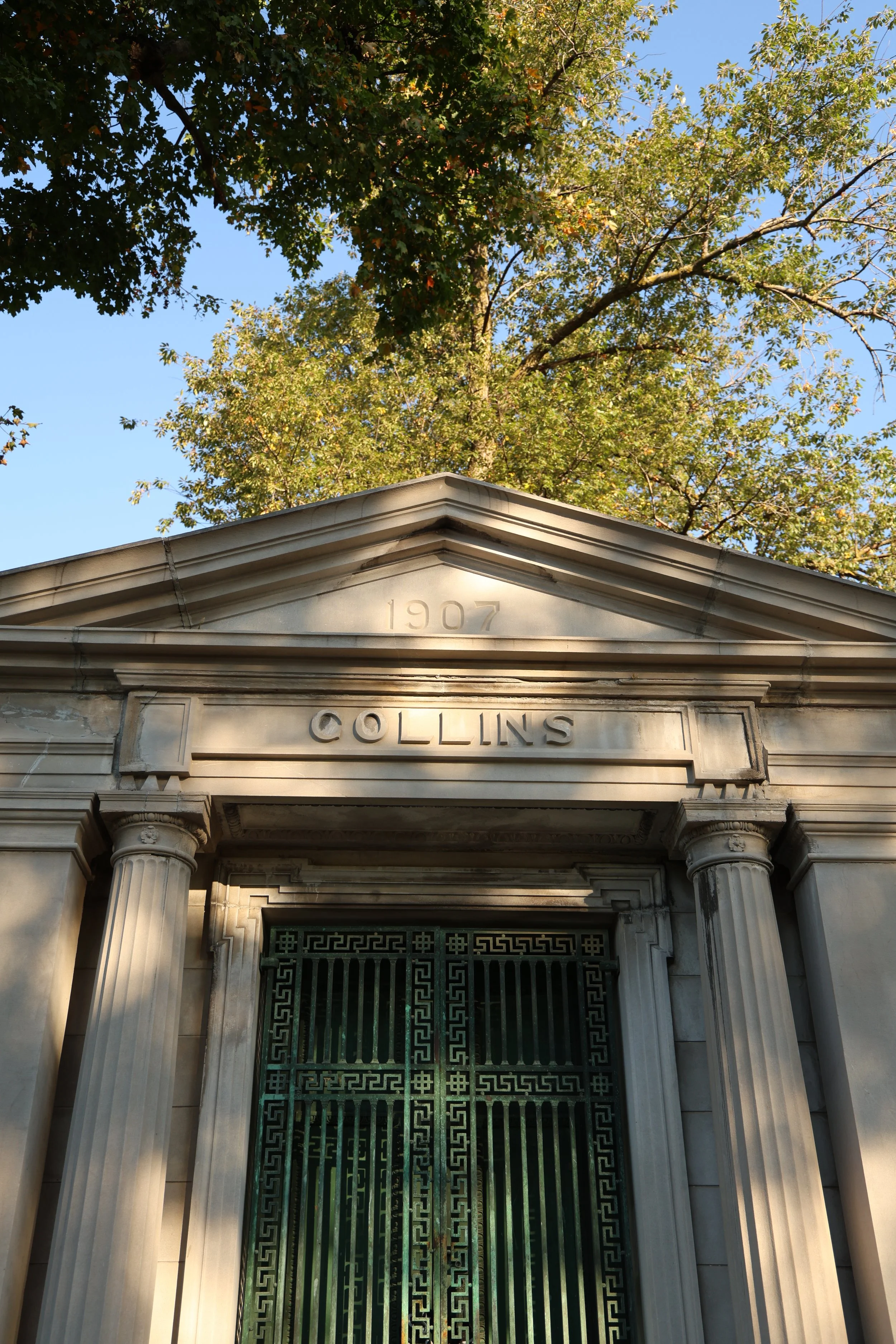 The McCord mausoleum. The stone pillars, large wings guarding the entrance and iron flowers on the gates are a nod to Egyptian influence.